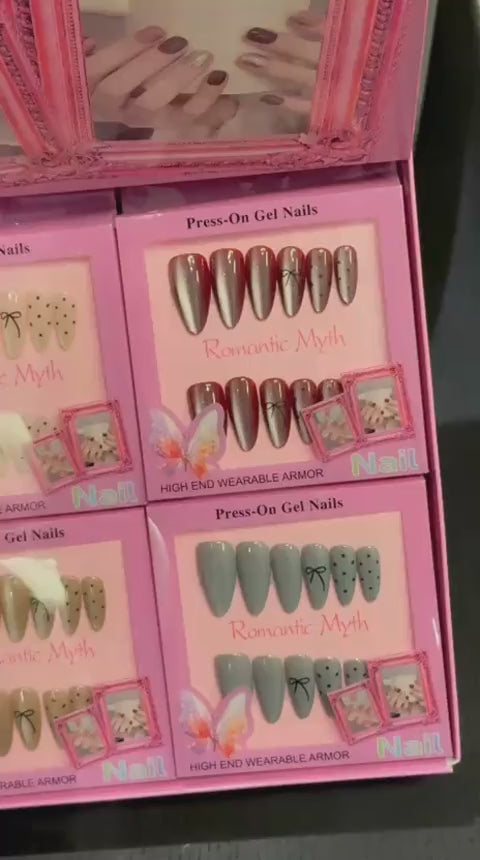 Pack of 12 - Cat Eye Nails Luminous Magnetic Effect Soft Nude Champagne Gold Almond Nails With Shimmer Polka Dots And Fine Bow Line Art (Random Design)